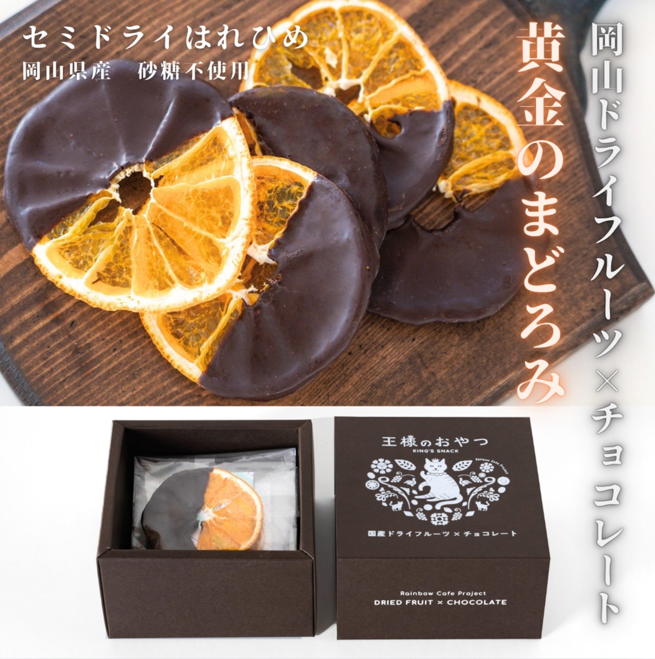 岡山県倉敷市で丁寧に育てられた「はれひめ(みかん)」を半生食感の無添加ドライフルーツに仕上げた後、リッチなチョコレートをコーティング。自然の甘みと濃厚なチョコの味わいが融合した、ココロとカラダに寄り添う安心して楽しめるヘルシーなお菓子です。