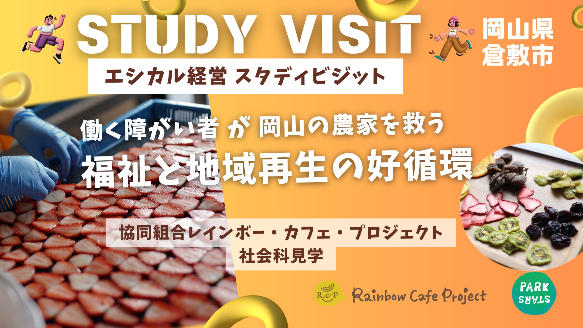 王様のおやつドライフルーツ製造現場を見学しませんか?障がい者自立支援の協同組合レインボー・カフェ・プロジェクト独自のビジネスモデルの工夫の裏側などを見学いただきながら、参加者の皆さんと「エシカル」なビジネスやライフスタイルを深掘りしていく体験型プログラムとなっています。個人の方から法人・団体の方までご参加いただけます。以下のお申し込みフォームから、ぜひお気軽にお問い合わせ・お申し込みください。